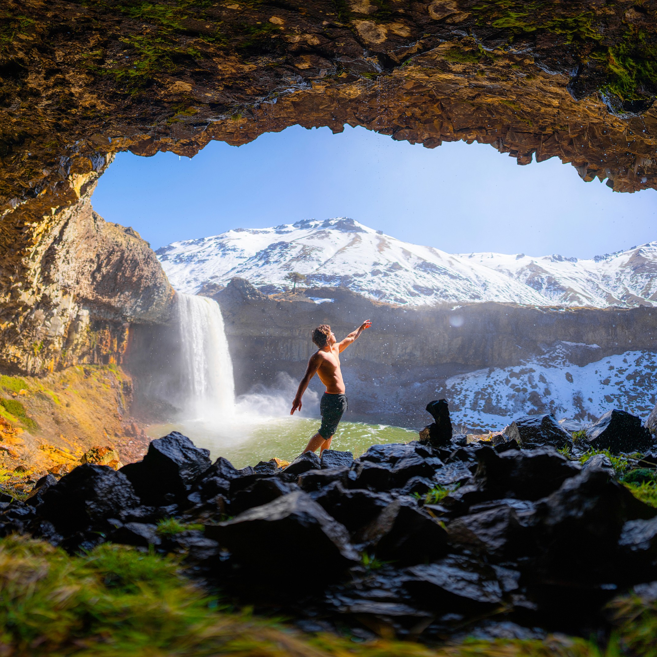 The cave behind you, dark and safe, embodies all you know, everything that once embraced you. But look ahead. That landscape, that endless waterfall, the white mountain, is not just nature: it is possibility. It is the unknown, the call to step out of your refuge, to face what you cannot control.