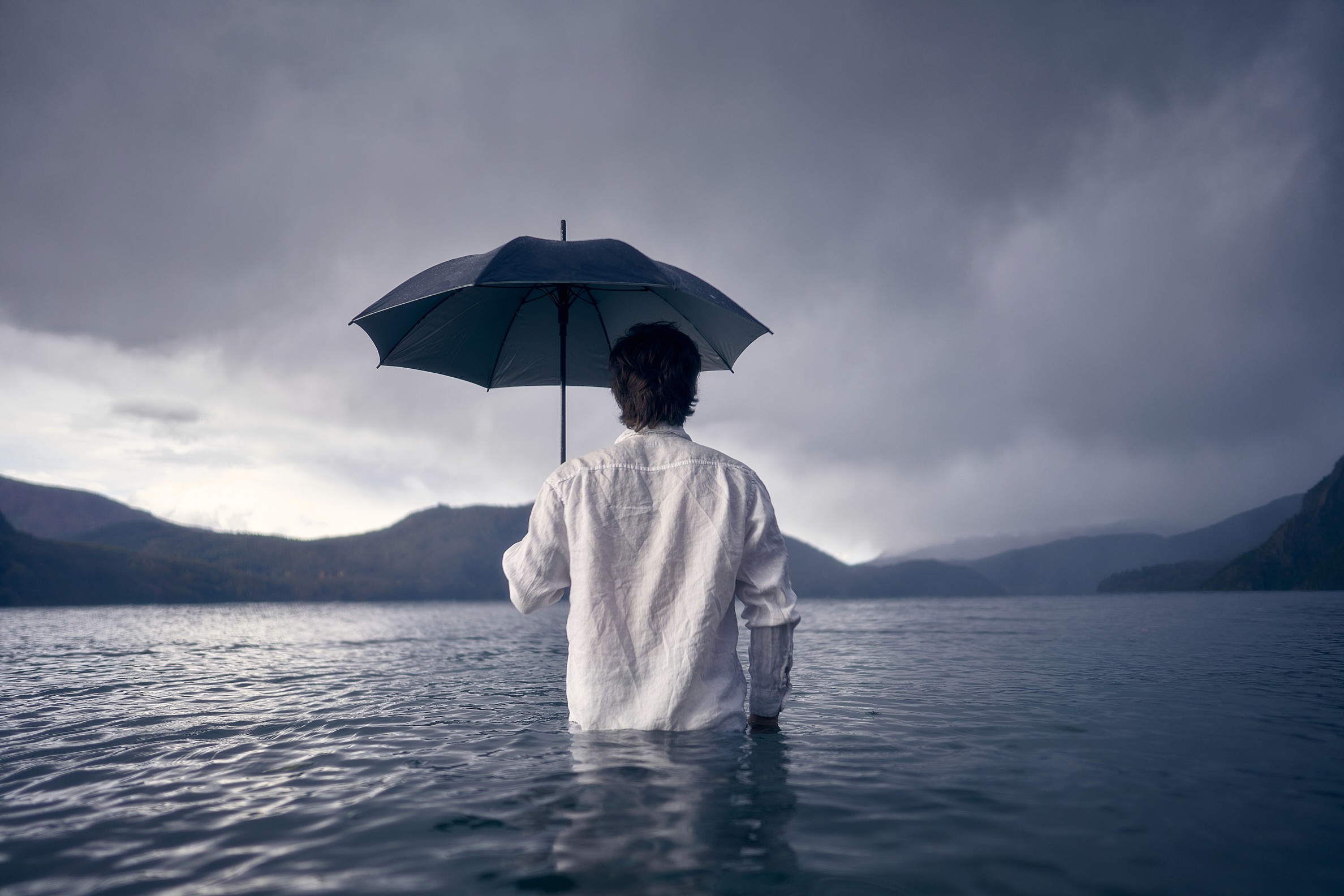 The water surrounds you, rising up to your waist, and the heavy sky threatens to spill more than it already holds. Yet there you are, holding an umbrella. Why? What do you believe you are protecting?
