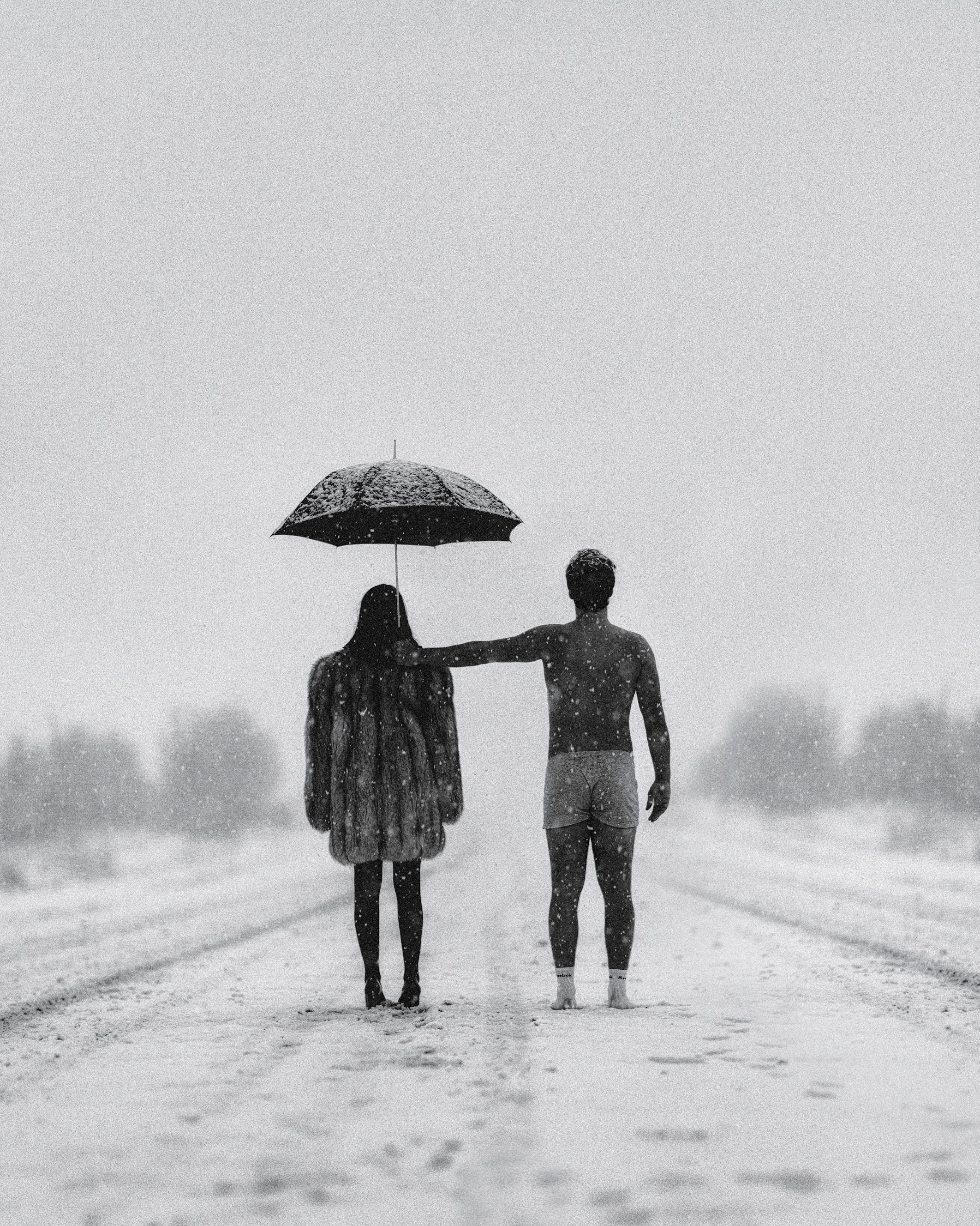 Mirá esta escena. Observá. ¿Quién sos acá? ¿El que lleva el abrigo pesado, sosteniendo el paraguas? ¿O el que camina desnudo, expuesto al hielo? Es fácil elegir, ¿no? El abrigo suena más cómodo. Pero no siempre es así. A veces sos el que protege, el que da, el que lleva el peso. Otras veces sos el que tiembla, el que necesita, el que espera que la mano sobre el hombro no se aparte.