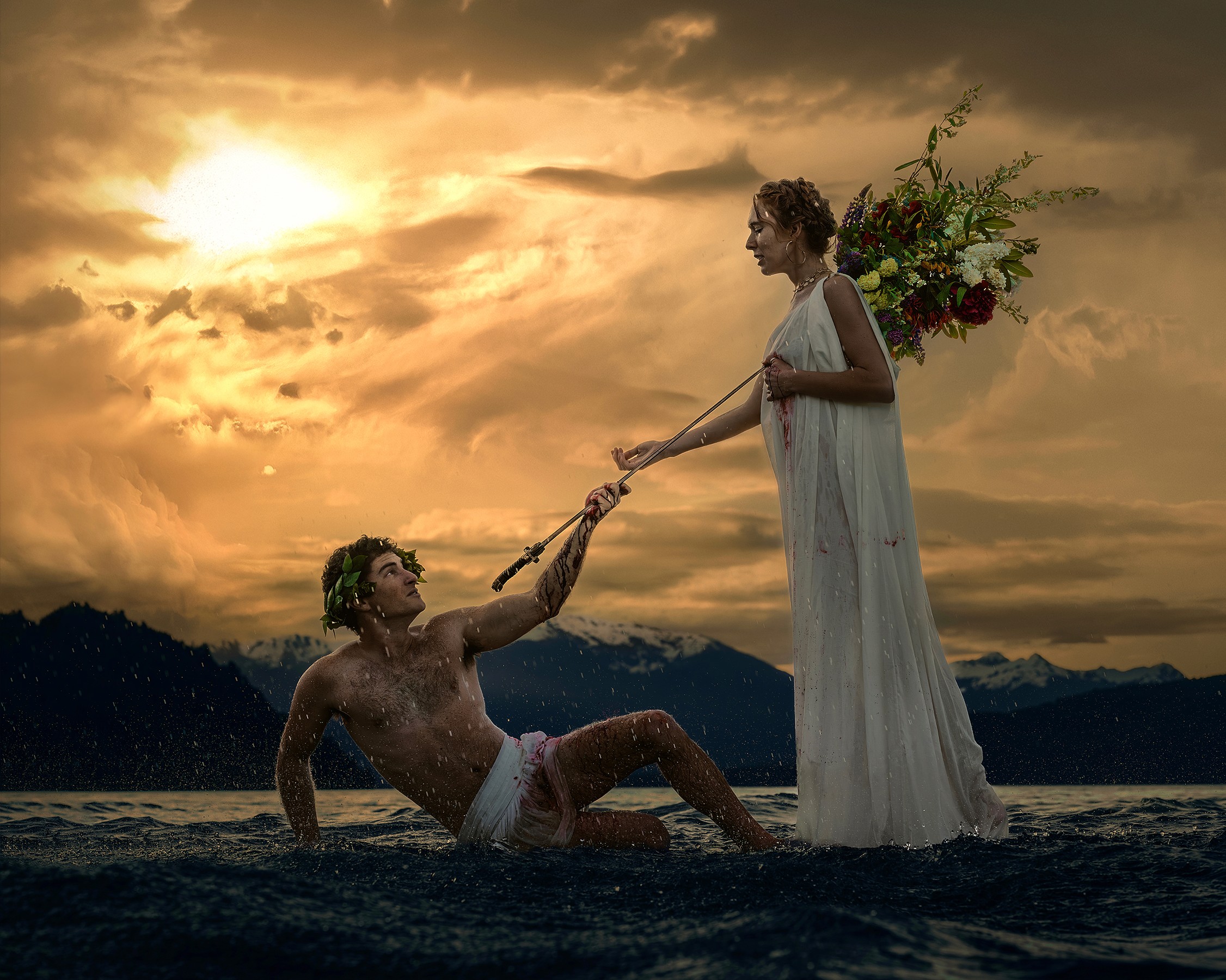 El hombre está parado en el agua, con el cuerpo lleno de dolor y dudas. Cada músculo quiere escapar. Pero lleva una corona de laurel. Porque ya ganó. Ganó al reconocerse, al mirar al miedo y seguir caminando igual.